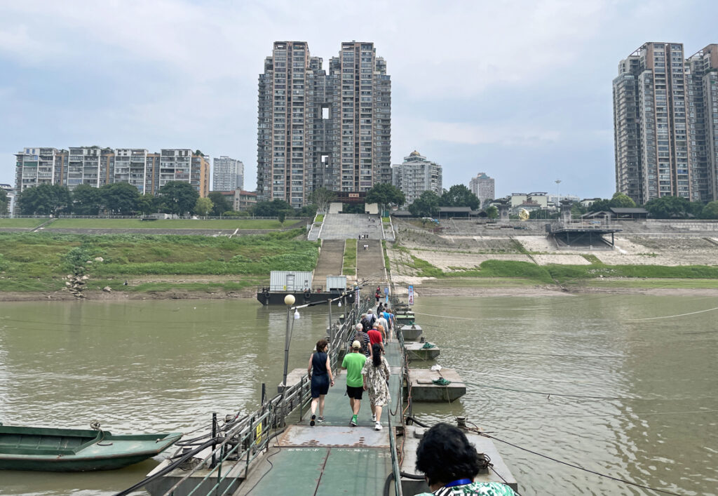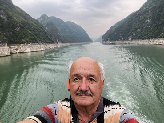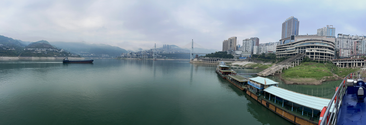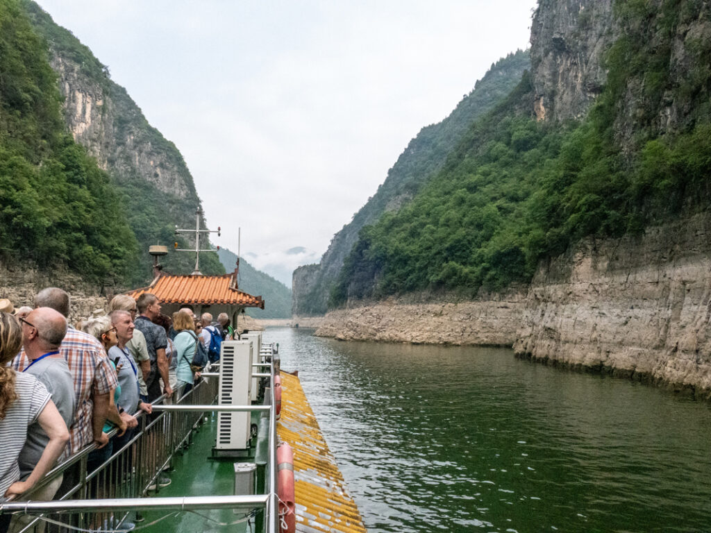 Der Schnellzug bringt uns mit 250 km/h, in ca. sechs bis sieben Stunden nach Yichang (1200 km), wo wir abends an Bord unseres Premiumschiffes gehen und die traumhafte Yangtze-Flusskreuzfahrt beginnt. Zum Glück gibt es von oben nach unten eine Kabine, die uns die 450 Stufen zum Schiff erspart.