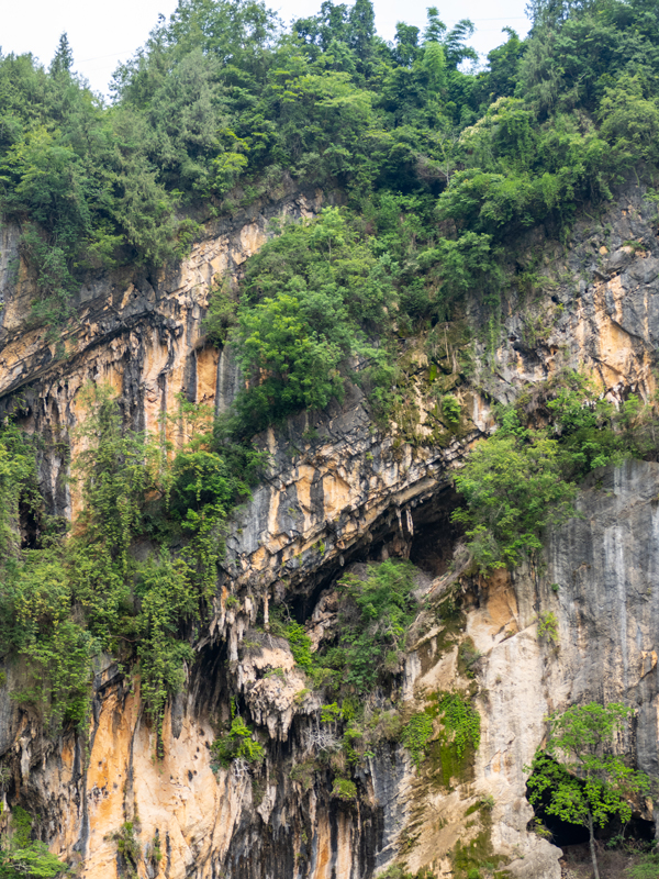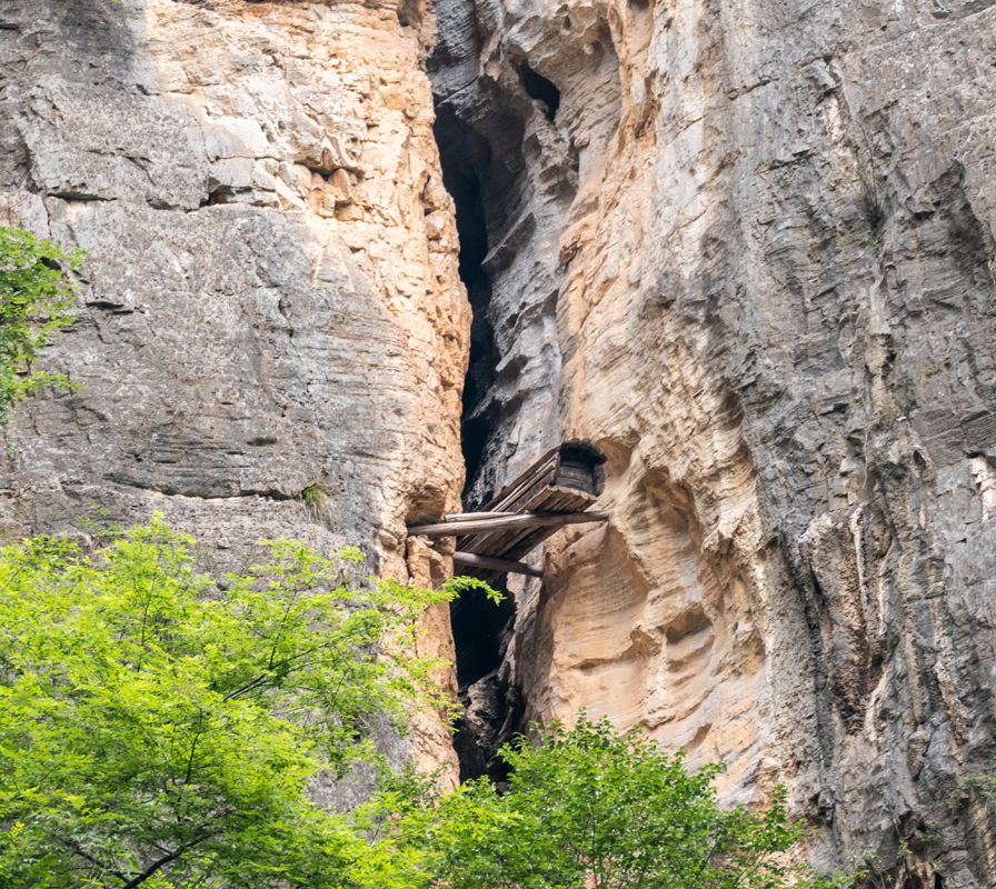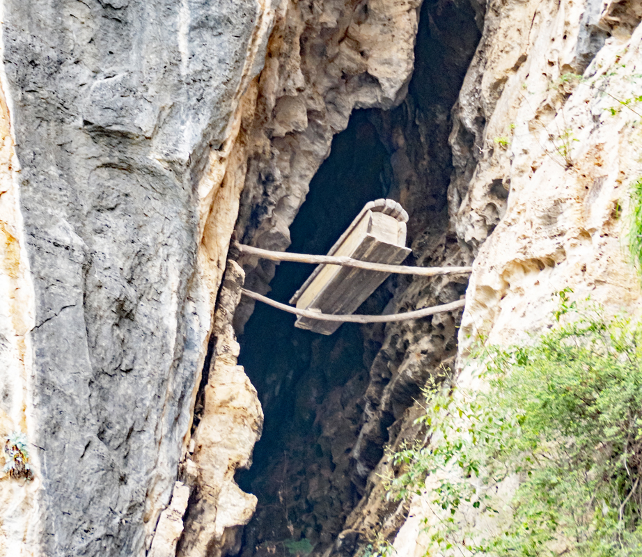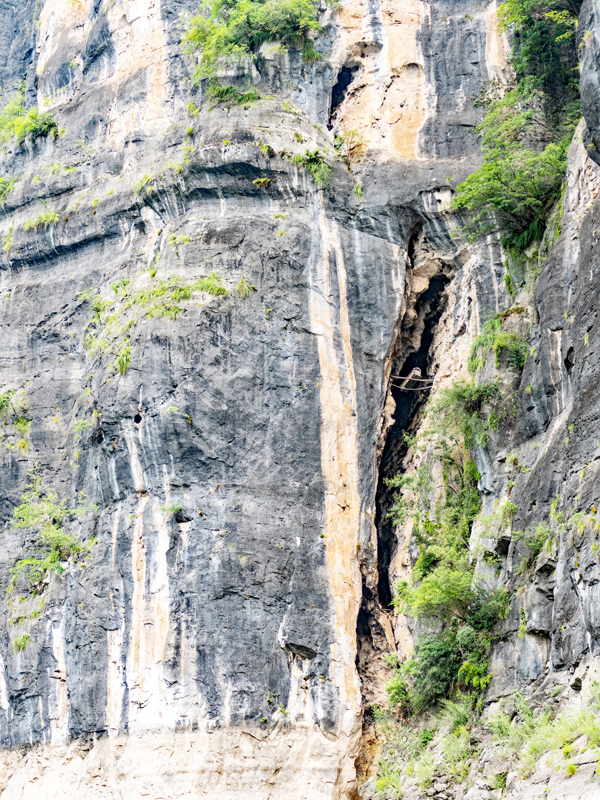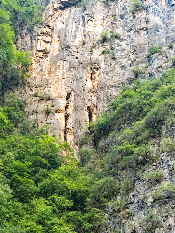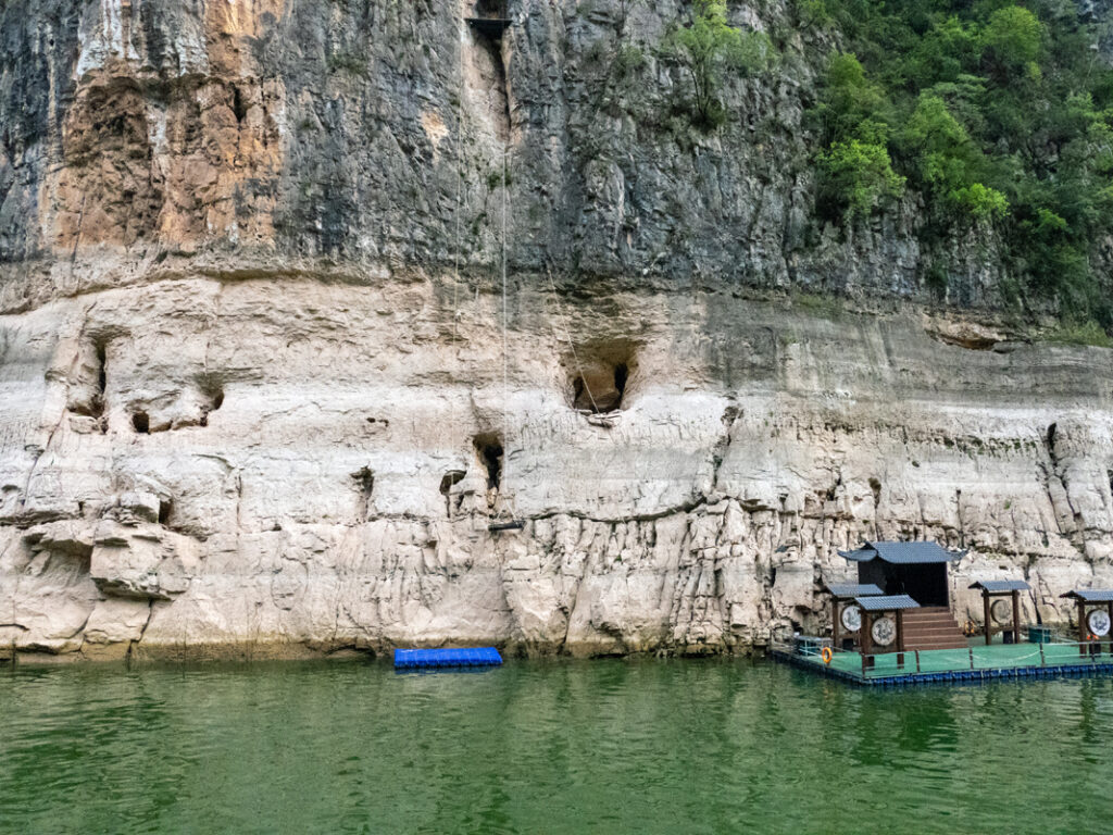 Der Shennong Xi (Daning River) ist ein malerischer Nebenfluss des Jangtse bekannt für seine unberührte Natur, steilen Klippen und die Mianzhu-, Yingwu- und Longchang-Schluchten. Ein übersetzter Name hat mir besonders gut gefallen – „die Schlucht des tropfenden Grüns“. Und dann kommen wir zu den berühmten „hängenden Särge“, die an den Klippen befestigt sind. Sie wurden wohl mit einem Seilzug in schwindelte Höhen befördert und dann auf Stangen gelegt. (Suchbild weißer Pfeil 😊)