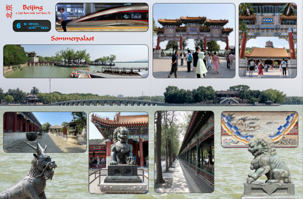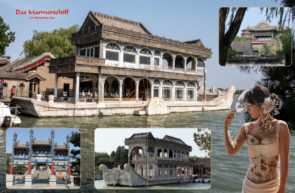 Nach unserer Ankunft in Bejing – besuchen wir noch den Sommerpalast, der im 18. Jhd. erbaut wurde und damals die Sommerresidenz der chinesischen Kaiser war. Das Marmorschiff (Pavillon der Reinheit und Anmut) ist ein Highlight der Qing-Dynastie am Ufer des Kunming-Sees. Als steinerner, nicht schwimmender Prunkbau symbolisiert es Stabilität. Ein 728 m, sehr langer Wandelgang entlang des Sees, führt dorthin, aber ich wollte unbedingt das mamorne Schiff sehen.