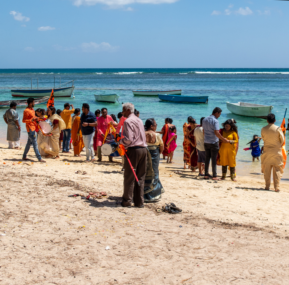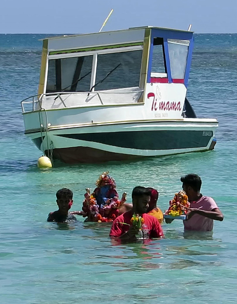 Die Gläubigen bringen eine Lehm-Statue von Ganesha zum Strand, um sie dort in das Wasser einzutauchen und langsam verschwinden zu lassen. Dieses Ritual symbolisiert die Rückkehr von Lord Ganesha in sein Element – Wasser, bis er im nächsten Jahr wieder zur Mutter Erde zurückkehrt