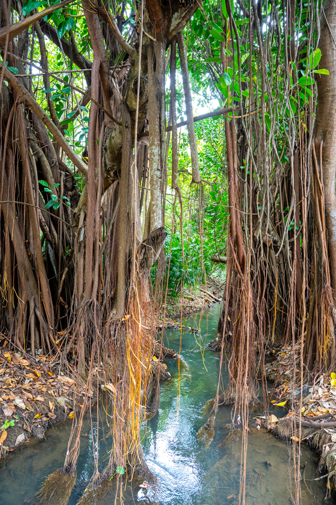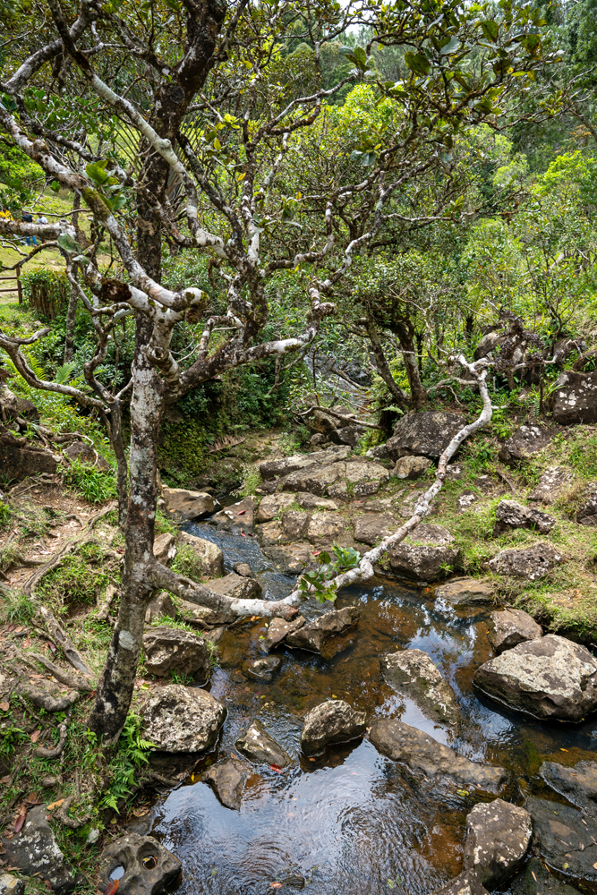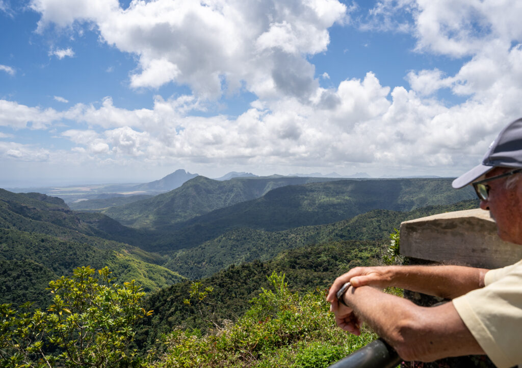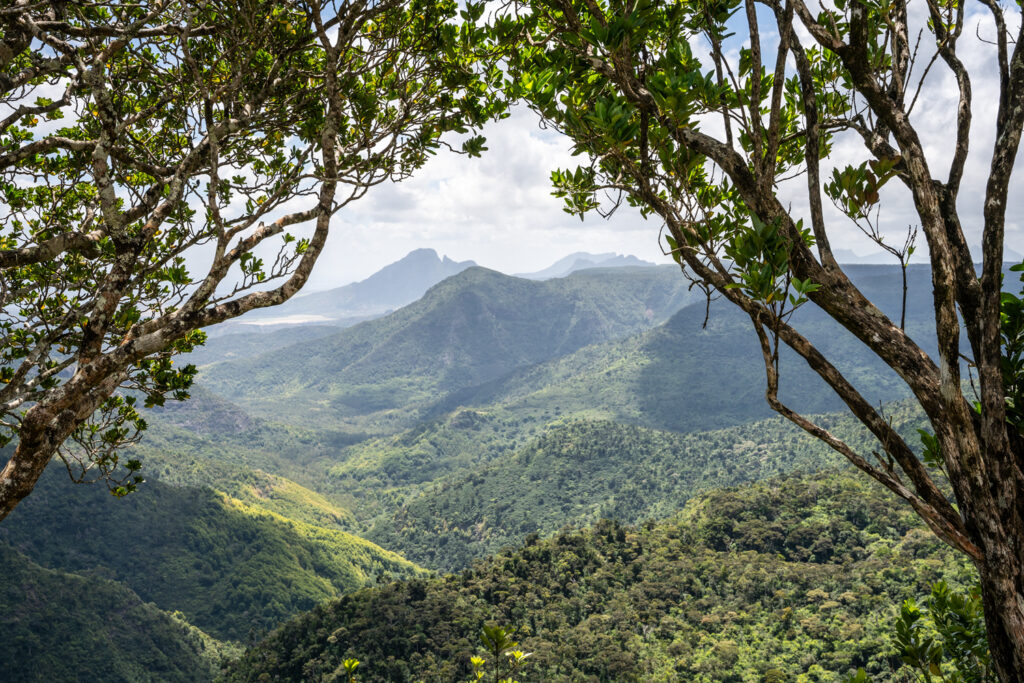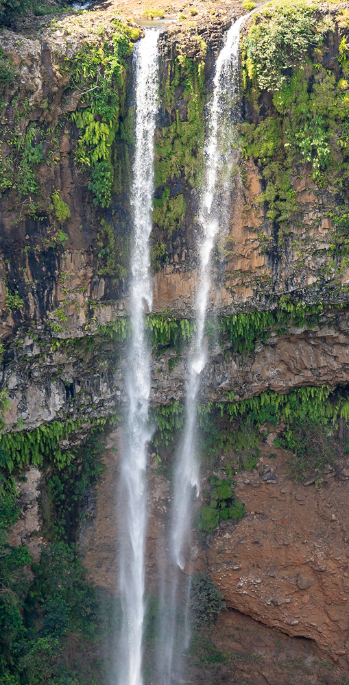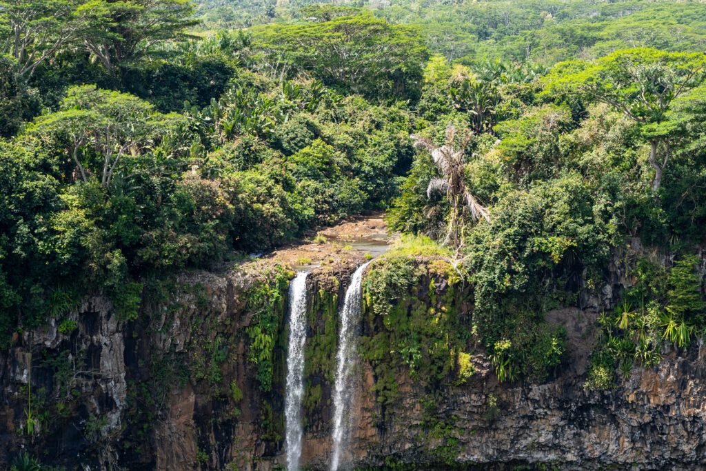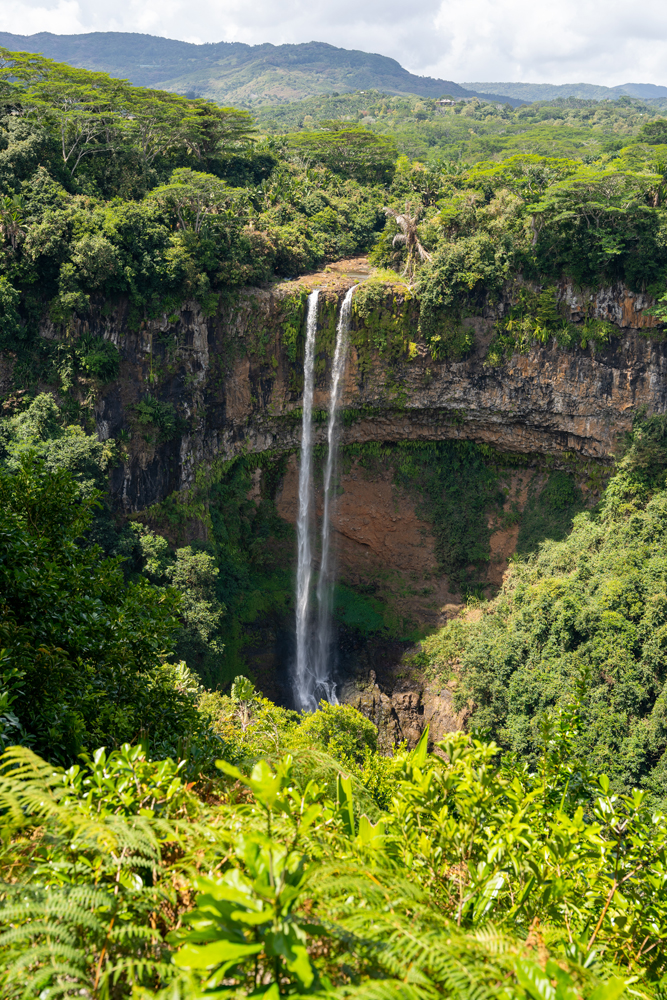 durch wilde urwüchsige Wälder, weite Blicke, schöne Wasserfälle, wie der 100 m hohe Zwillings-Wasserfall Chamarel und der siebenfarbigen Erde